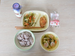 メニューは、古代米入りごはん、鶏肉のレモンソース、塩昆布和え、お祝い澄まし汁、お祝いデザート(プチケーキ)でした。