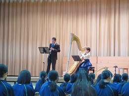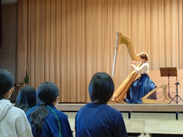 生演奏でハープの音を聞くのが初めての生徒が多く、演奏が始まると同時に真剣に聞き入っていました。